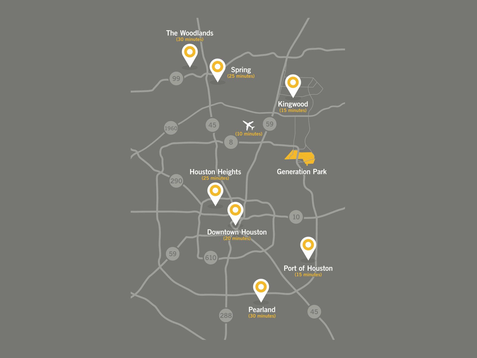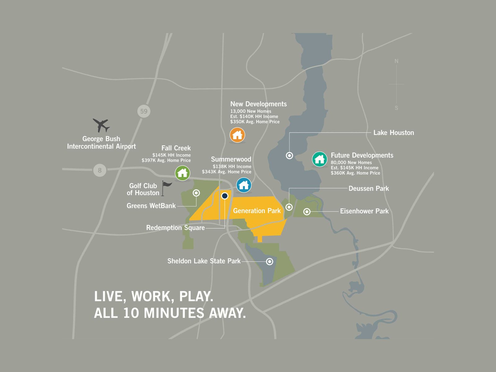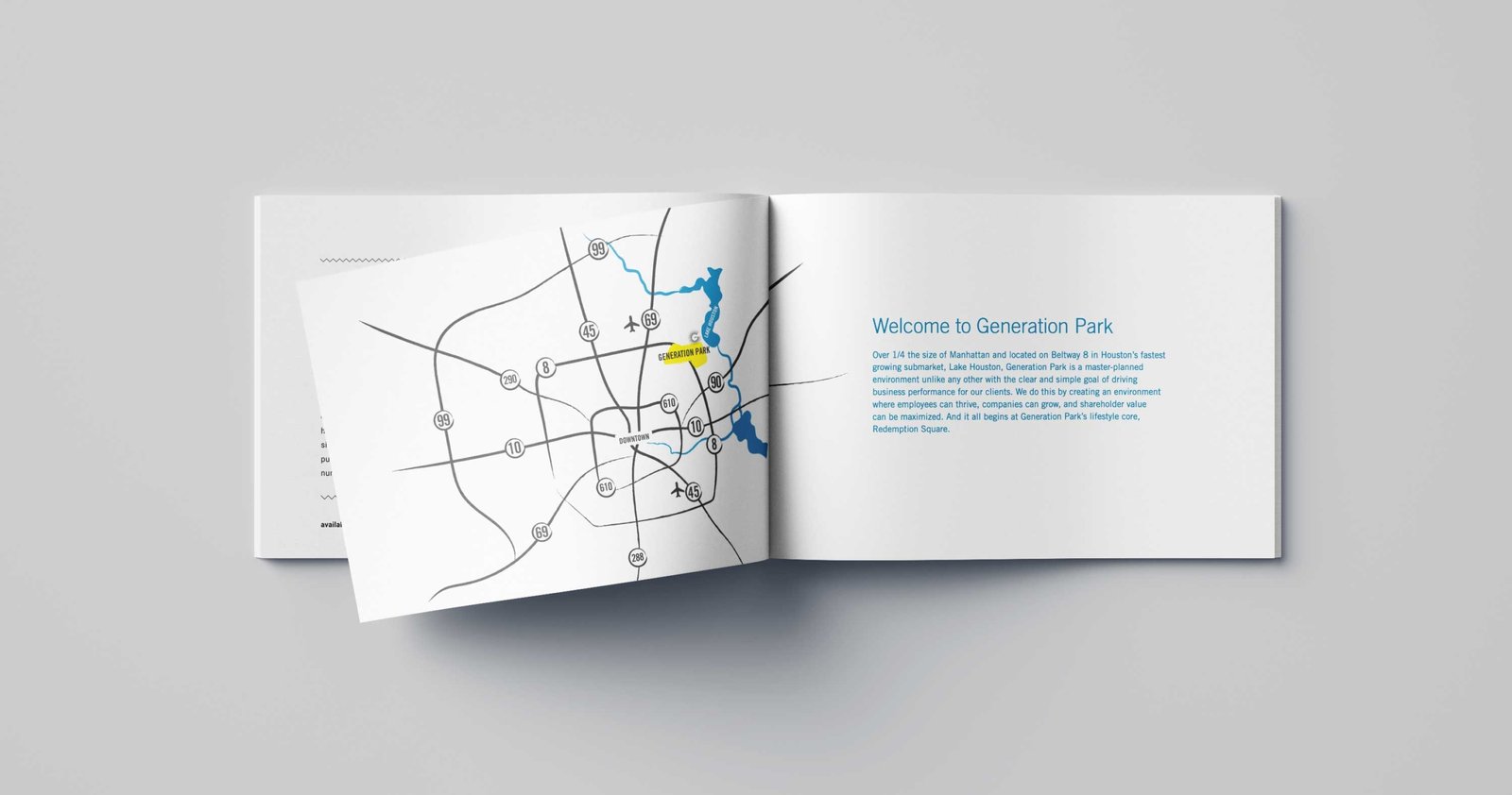 Generation Park, a master-planned development focused on the intersection of business, community, and lifestyle, required marketing collateral that appeals to a wide audience. The materials highlight the park’s strategic location near Beltway 8 and major regional infrastructure, its purpose-driven placemaking, and its appeal to companies, residents, and visitors.