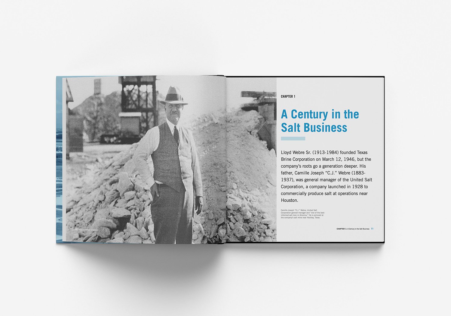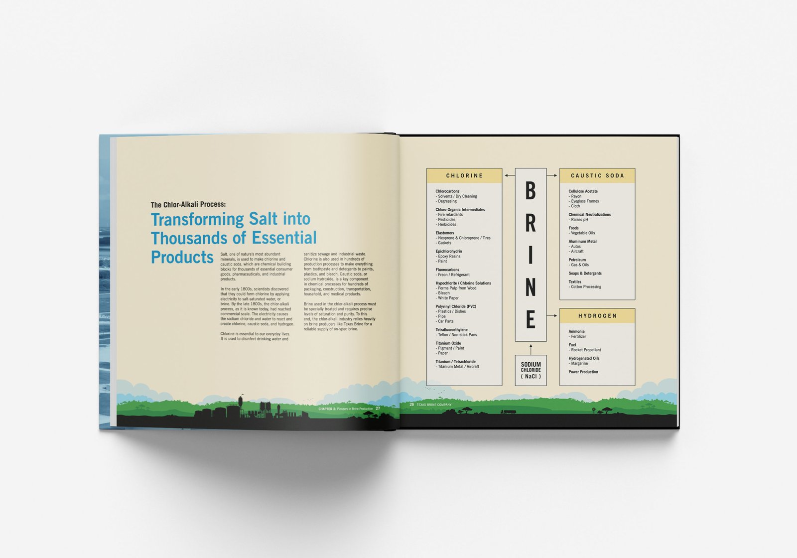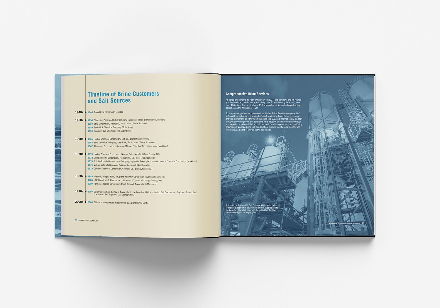 Texas Brine Company, a family-owned salt mining business, marked its 75th anniversary in 2021 with a commemorative history book that tells the story of the company’s growth and legacy. The project combined anniversary branding, book design, and custom infographics and illustrations to help translate decades of history into a clear, engaging narrative. Working closely with copywriters and the printer on a condensed timeline, the final piece balances storytelling and design to create a book that honors the past while supporting the company’s future.