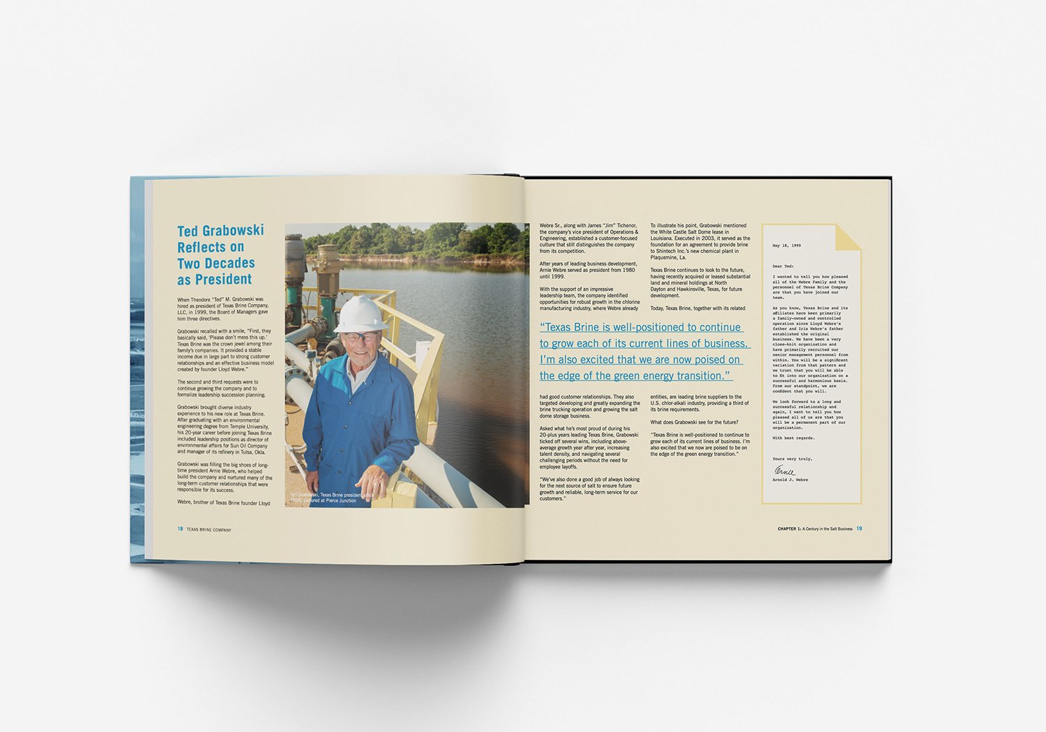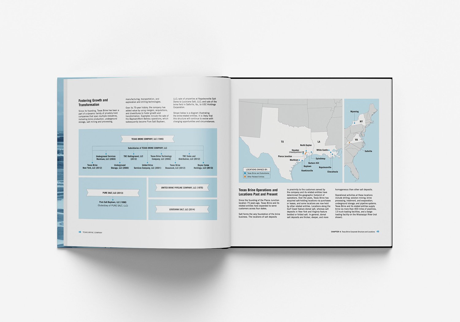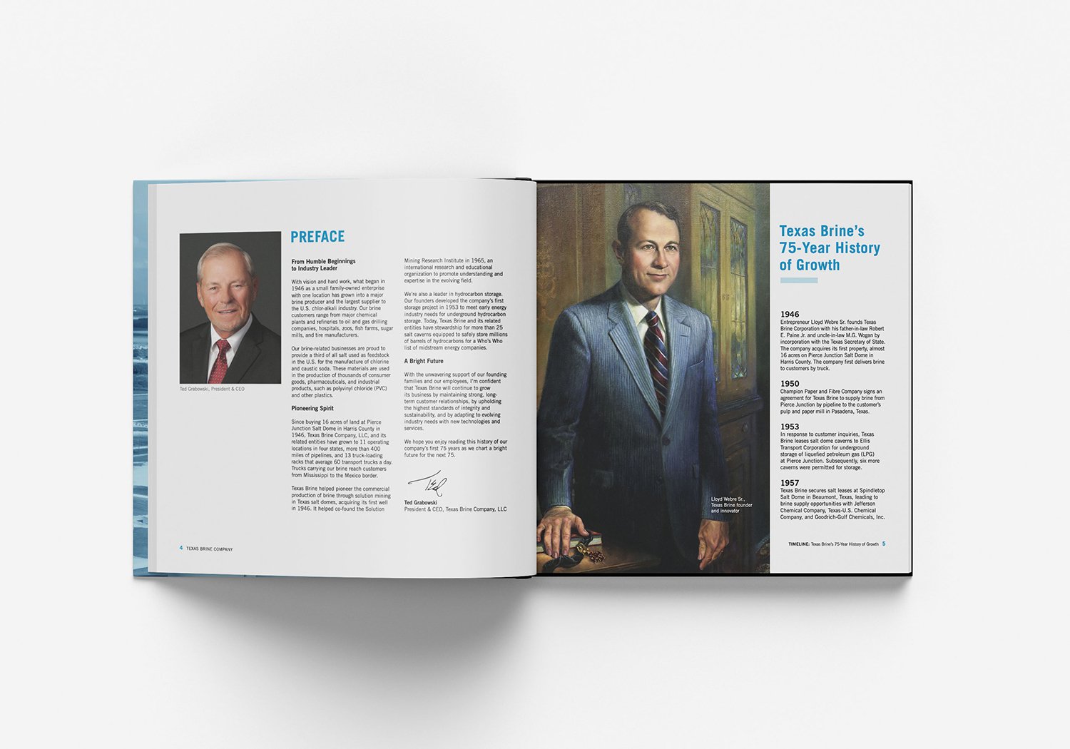 Texas Brine Company, a family-owned salt mining business, marked its 75th anniversary in 2021 with a commemorative history book that tells the story of the company’s growth and legacy. The project combined anniversary branding, book design, and custom infographics and illustrations to help translate decades of history into a clear, engaging narrative. Working closely with copywriters and the printer on a condensed timeline, the final piece balances storytelling and design to create a book that honors the past while supporting the company’s future.